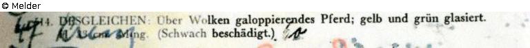 Sammlung Eduard Fuchs, erworben zwischen 1912–1922 und in dessen Besitz bis 1933; 25.10.1933 Beschlagnahmung durch die Gestapo; zwangsweiser Verkauf (Zahlung Reichsfluchtsteuer) 1937 durch seine Tochter Gertraud Fuchs: Versteigerung Auktionshaus Rudolph Lepke Berlin, Katalog 2115, S. 33 - am 15.10 und am 16.10.1937 wurde dieser Dachreiter unter Nr. 514 versteigert: „FAYENCE-DACHREITER: Über Wolken galoppierendes Pferd; gelb und grün glasiert. Höhe 33 cm. Ming (Schwach beschädigt)“.