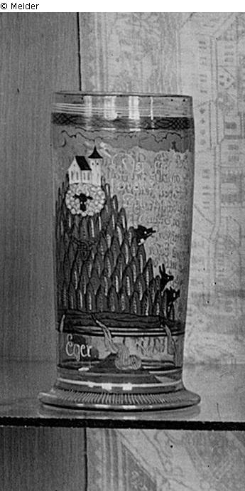Walzenförmiges Glas mit Bemalung: Fichtelberg mit Bewaldung, Kapelle und Turm, darunter ein Ochsenkopf mit Kette und Vorhängeschloss sowie Darstellungen der vier Quellen mit Bezeichnung „Mayn, Naab, Eger, Saal“. Auf der Rückseite ein 11-zeiliger Text.