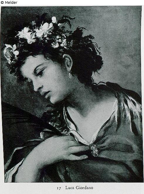 Bustbild eines Mädchens im kindlichen Alter, der Kopf links seitwärts geneigt, einen Kranz lebhaft farbiger Blumen im dunklen Lockenhaar. Leicht übergeworfenes rotbraunes Kleid, Palmzweig in der zur Brust erhobenen Rechten.