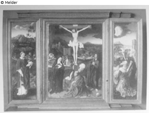 Triptychon Christus am Kreuz mit Maria, Johannes und Magdalena mit Sibylle von Tibur und Kaiser Augustus und einem Heiligen