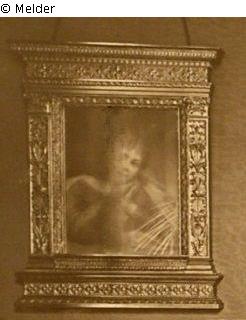 gerahmt, Bruststück einer Frau mit unter dem Kinn gefalteten Händen.