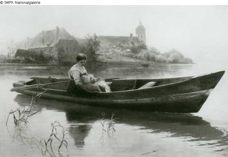 Tafelmalerei: Bild: Mutter mit Baby oder kleinem Kind & Bäuerin, Bauersfrau & mit dem Gesicht nach hinten rudern; das Ruder ziehen & See & Insel & Abtei, Kloster, Konvent in der römisch-katholischen Kirche & der Außenbau einer Kirche