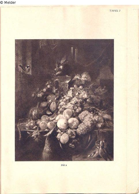 signiert; auf einem grünen Tisch reiches Stillleben von Pfirsichen, Aprikosen, Trauben, Maiskolben und anderen Früchten, von Insekten belegt, im Hintergrund zwei halbgefüllte Weingläser vor einer Draperie; Literatur: Galeriekatalog (3. Auflage) Nr. 2023