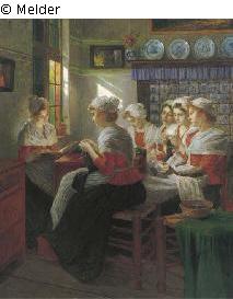 Fünf friesische Mädchen in einem Innenraum bei der Handarbeit, ein sechstes liest aus einem Buch vor
