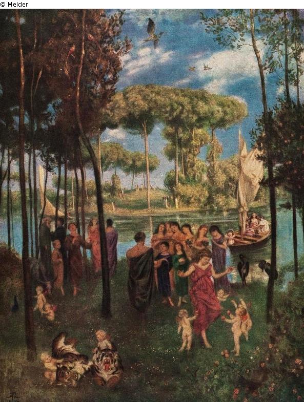 Arkadische Wiesenlandschaft mit Flußlauf, in der sich junge, antikisch gewandte Menschen musizierend unter hohen Pinienbäumen ergehen. Tiefblauer Wolkenhimmel. signiert l. u.: H. Th. 1879