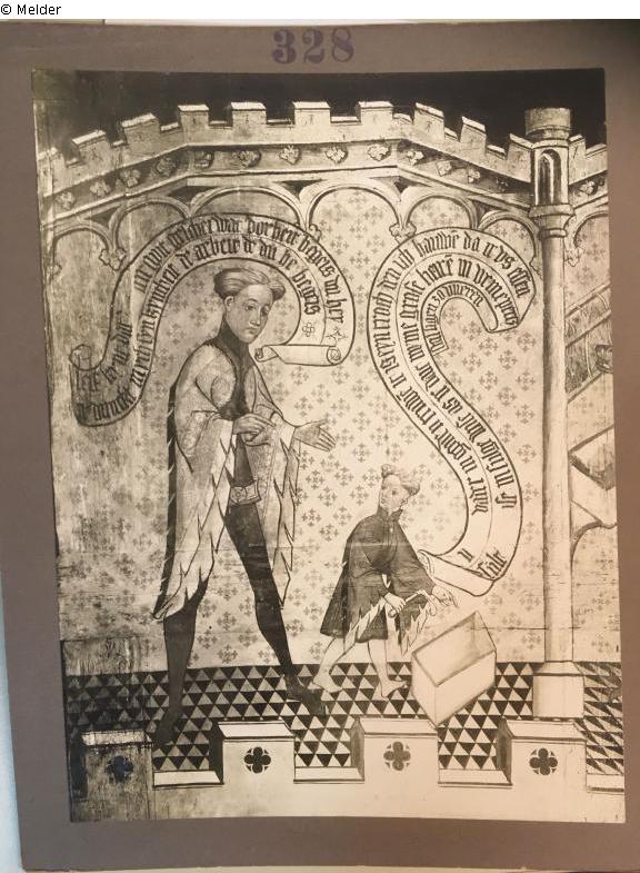 Wandgemälde mit Geschichte vom lieblosen Sohn (zweiteilig). Kleiner Teil: Köchin am Herd. Großer Teil: Geschichte vom lieblosen Sohn (Sohn und Enkel; Sohn vor dem Lager des Alten im Pferdestall; Mann und Frau führen den Alten zur Tafel). Alle Teile mit nicht lesbaren Inschriften auf der Vorderseite (Spruchband).