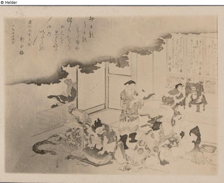 Die sieben Glücksgötter mit den Vorbereitungen zum Neujahrsfest beschäftigt. Bishamon gibt zum Schmuck der Tokonoma seine Pagode, Ebisu legt seinen Tai Fisch auf ein Geschenktablett.