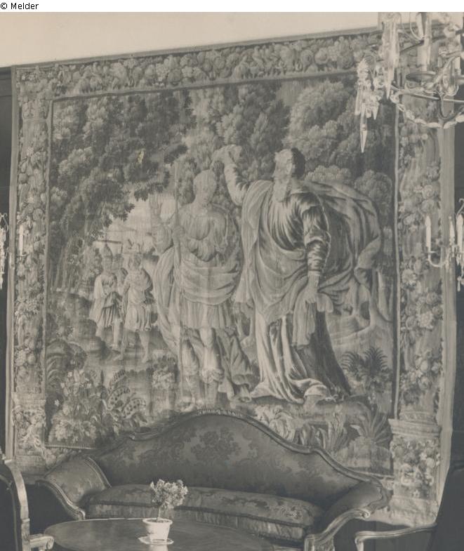 Samuel salbt Saul; Taufszene, Parklandschaft in blau, grün und beige; Bordüre: seitlich Säulen mit Fruchtgewinden, oben und unten Blumengirlanden