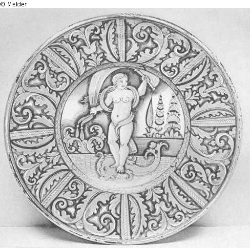 Goldener Lüsterteller mit Fortuna auf Delphin