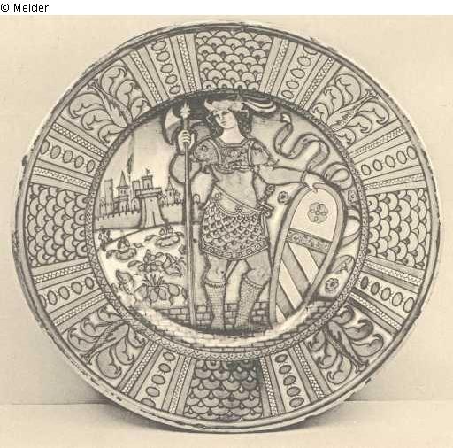 A FINE GOLD LUSTRE DERUTA DISH, painted with a standing figure of a young soldier wearing a helmet, lion-head epaulettes and a sword at his side, in his right hand a halberd, in his left a shield with the Orsini Arms, beyond a tessellated pavement, flowers and a view of a castle and city in the distance, a border a quartieri of flowers and scale ornament [type cf. Rackham Guide, pi. 28a), the underside of the dish with a buff glaze and foot rim pierced for suspension, circa 1525