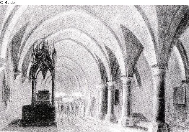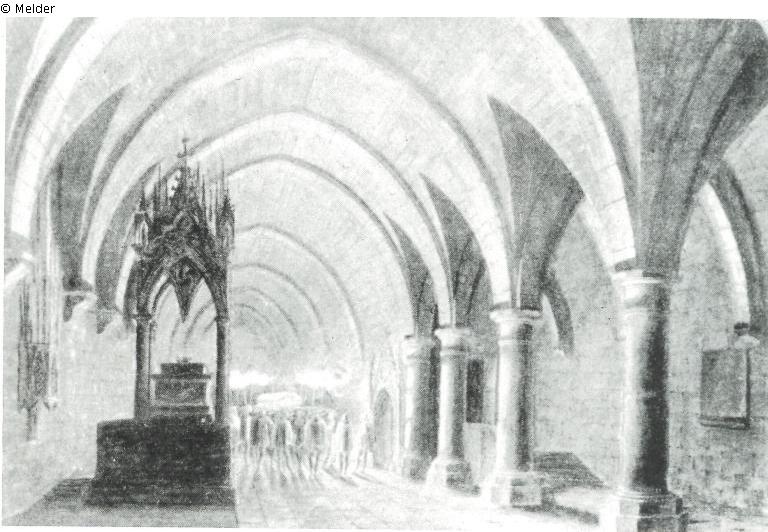 Ein hohes düsteres Gruftgewölbe, links im Vordergrund ein reichverziertes Grabdenkmal im gotischen Stil. Im Hintergrund wird ein Sarg mit Gefolge bei Fackelschein zur letzten Ruhe gebettet.