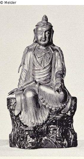 mit Buddhadiadem auf dem Kopfe, auf reich geschnitztem hohen, felsenartigem Holzuntersatz, das rechte Bein aufgestellt, den linken Fuß über das rechte Knie gelegt. Feuervergoldet. China, Anfang 18. Jahrh.