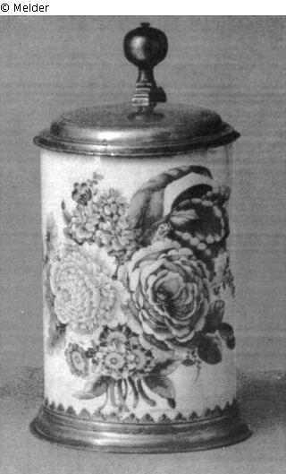 Mit Deckel und Fußring aus Zinn. Glatt. Der Henkel aus zwei volutierten Bögen gebildet, die an den Ansätzen purpurn staffiert sind. Bunte Bemalung: An der Stirnseite großer Blumenstrauß. Ohne Marke. Eingedrückt: L. Unter dem Fußreif repariert.