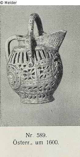 Dorotheum: 589 Schnabelkrug aus Hafnerkeramik, grün glasiert, die Wandung durchbrochen gearbeitet, darauf drei Medaillons, deren zwei je einen Doppeladler, das dritte ein Medusenhaupt im Relief tragen, Tragbügel und drei Henkel mit Rosetten ornamentiert, doppelwandig, Höhe 28 cm, österreichisch, um 1600 (siehe Abbildung Tafel 41)