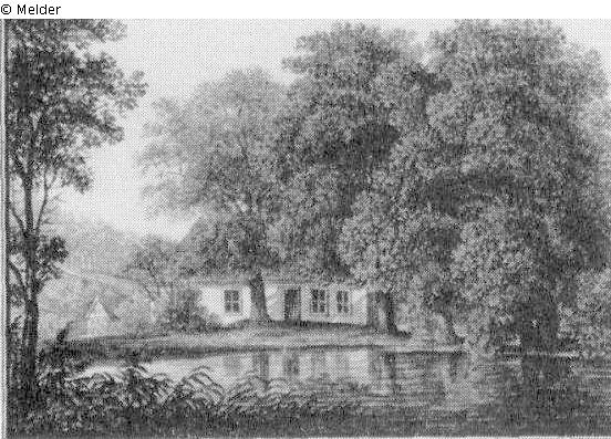 Haus unter Bäumen an einem Teich