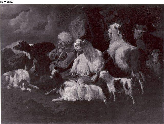 Hirt und Herde mit zwei Hunden
