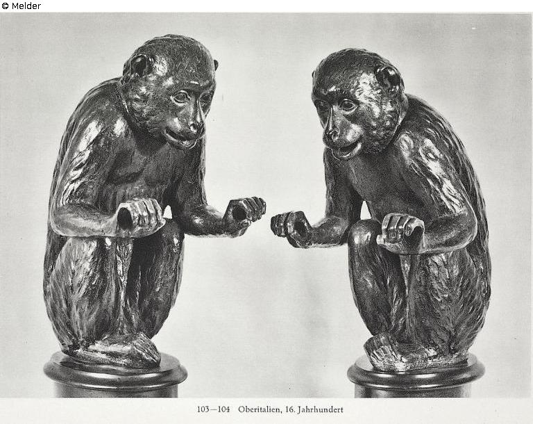 Mit scharf angezogenen Hinterbeinen und gekreuzten Pfoten. Den Kopf wenig vorgeneigt, das Maul geöffnet. Die Vorderpfoten sind in Griffstellung nach vorn gehalten. Bronze, Hohlguß, schwarzbraune Patina. - H. o. S. 34 cm. Vgl. einen stilistisch ähnlichen Bären bei Bode, Bronzestatuetten, außerdem ähnliches Stück im Museum zu Budapest (Sammlung Egger). Quelle: Hugo Helbing Kunsthandlung und Kunstversteigerungshaus: Kunstbesitz eines Berliner Sammlers. Katalog Nr. 49. (DOI: Externer Link)