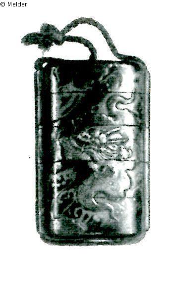 Sammlung Eduard Fuchs, erworben zwischen 1912–1925 und in dessen Besitz bis 1933; 25.10.1933 Beschlagnahmung durch die Gestapo; zwangsweiser Verkauf (Zahlung Reichsfluchtsteuer) 1937 durch seine Tochter Gertraud Fuchs: Versteigerung Auktionshaus Rudolph Lepke Berlin, Katalog 2115 - am 15.10 und am 16.10.1937 wurde diese Kleinplastik unter Nr. 289 versteigert: „INRO: Schwarzlack, fünfteilig. Drachen in Wolken in Goldlack und metallischem Silber. 8,5 cm. Japan. Abbildung Tafel 11“.