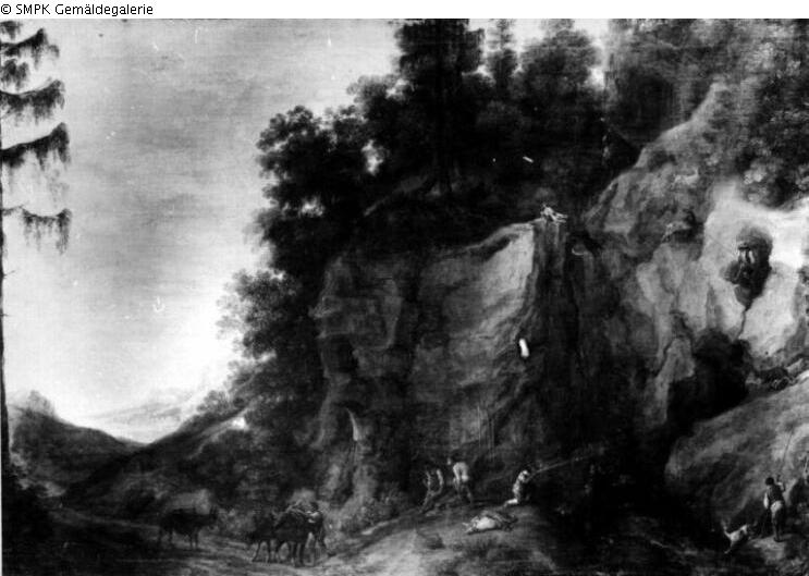Tafelmalerei: Bild: Jagen; die Jagd & Ziege & Felsen; jagen; Berufe & Ziege; Schaffell & Fels(en)