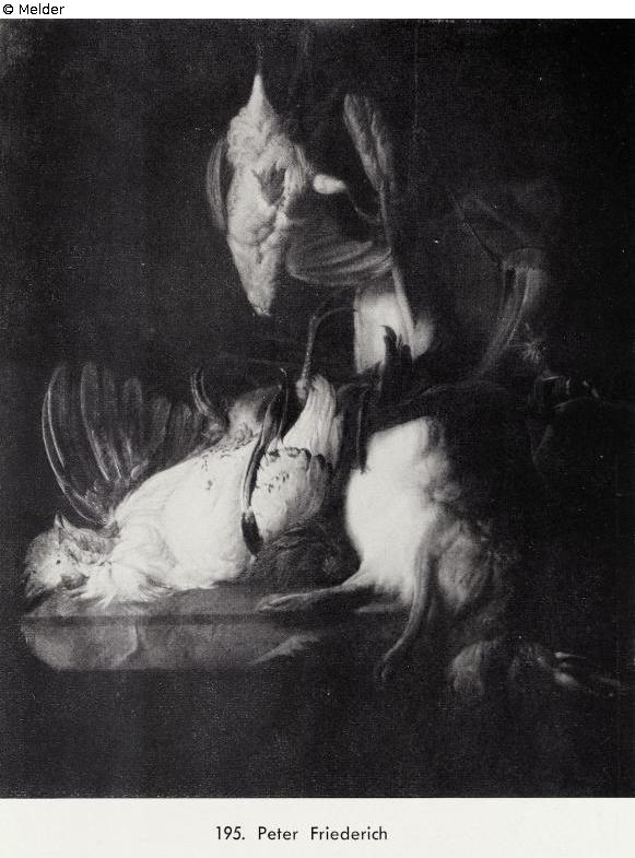 Das Bild wurde im Sommer 1925 im Städelschen Kunstinstitut auf der Ausstellung von Meisterwerken Alter Malerei aus Privatbesitz ausgestellt unter dem Titel "Peter Friderich, unbekannter deutscher Maler des 17. Jahrhunderts, mit der Motivbeschreibung "Stilleben: Hase Hahn und Rebhuhn" signiert unten rechts: Peter Friderich. Als Maße wurden dort Höhe 1,138 m, Breite 0,968 m angegeben. Siehe auch "Vorläufiges Verzeichnis der Ausstellung von Meisterwerken Alter Malerei aus Privatbesitz im Städelschen Kunstinstitut, Frankfurt a. M., Sommer 1925", Katalog Pos. 82.