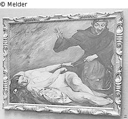 Liegender Akt, linke Bildhälfte, Joseph rechts halb zu der Frau gewandt, die ihn am Kleid zurückhalten sucht; Joseph in abweisender Handgeste