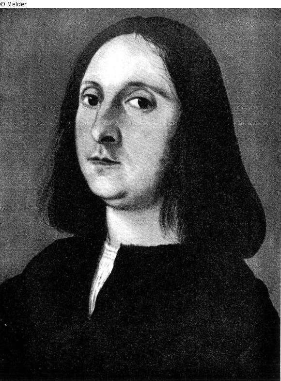 Vor mattblauem Grunde Brustbild eines Jünglings mit langem, braunen Haar, der den Betrachter anblickt. Über einem weißen Unterkleid dunkles, gemustertes Brokatgewand.