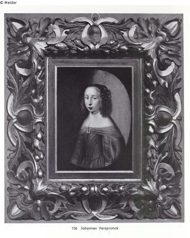 Lepke: Halbfigur. Das herabhängende blonde Haar mit roter Schleife; breiter Battistkragen, graues, mit gelber Litze benähtes Kleid. Malerei oval gerundet. Großer vergoldeter u. bemalter italienischer Rahmen.