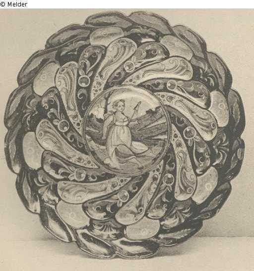 Kannelierte Schüssel (Tazza) mit sitzender Figur in Landschaft
