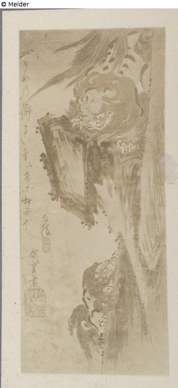 Der alte Löwe hat sein Junges den Felsen huntergeworfen und beobachtet nun, um seine Lebenstüchtigkeit zu erproben, ob er fähig ist, wieder emporzuklimmen. Ichiryusai Hisoshige I lebte von 1797-1858. Er kommt aus der Schule des Toyohiro und schloss sich stark an Hokusai an.
