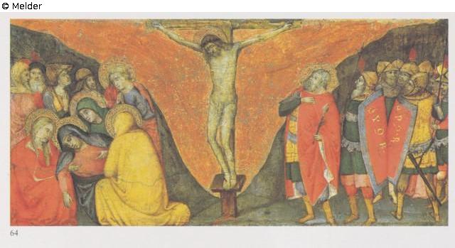 Das Gemälde zeigt die Kreuzigung Christi auf dem Kalvarienberg, umgeben von intensiven Emotionen und religiöser Symbolik. Auf der linken Seite trauern Maria und die Jünger, während rechts Soldaten mit roten Schilden und Rüstungen stehen. Der Hintergrund des Tafelbildes besteht aus einem Goldgrund, welcher das Thema des Gemäldes leuchtend hervorhebt.