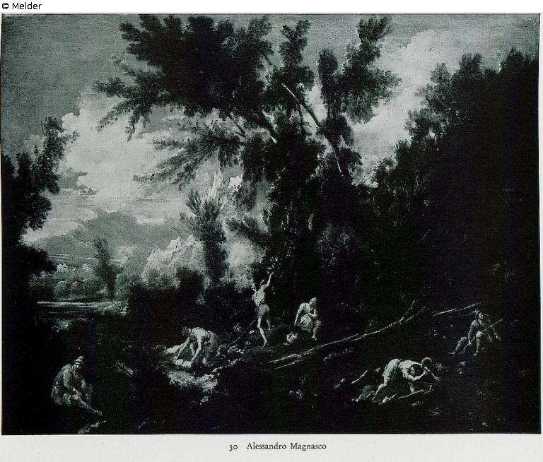 In einem traumhaft anmutenden Bergtal, von Bäumen und Buschwerk in seltsamer Gestaltung bewachsen, sind schs Personen in einer quer durch das Bild gehenden Reihe, mit fast gleichen Abständen voneinander verteilt, mit den verschiedensten Arten des Waldrodens und sonstiger Forstarbeit beschäftigt. Fahrige, eckige und zackige, übersteigerte Bewegungen der einzelnen geben dem Ganzen einen gespensterhaft faszinierenden Ausdruck. Dieser wird noch verstärkt durch den in eisiger Kobaltbläue belichteten Hintergrund, der den olivgrünen, perlmuttergrauen Gesamtton der vorderen Landschaft zu absorbieren scheint.