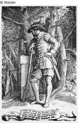 beschr. u.l.: der/ Freischütz, u.M.: Jetzt ist wohl ihr Fenster offen; und sie horcht auf meinen Tritt./ Lässt nicht ab vom treuen Hoffen:/ Max bringt gute Zeichen mit., u.r.: von/ C.M.vWeber.