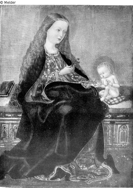 Madonna mit Kind, vor Goldgrund auf einer Bank sitzend, das nackte Christuskind ein blaues Kännchen in den Händen. Maria in goldbraunem Brokatgewand, an den Säumen perlenbesetzt, und dunkelgrünem, rot gefürttertem Mantel, mit offenem, lang herabfallendem Blondhaar. Auf dem Boden Blumen. Schriftliches Gutachten von M.I. Friedländer; Literatur: Abbildung Versteigerungskatalog Tafel 16