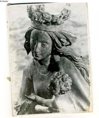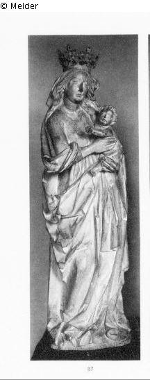 fein gearbeitete Madonnaskulptur, die das Kind auf ihrem linken Arm trägt, und mit der rechten Hand unter der Achsel stützt. Das Kind wiederum legt seinen rechten Arm stützend auf den Oberkörper der Mutter, die eine hohe Krone mit Akanthusblattmuster trägt.