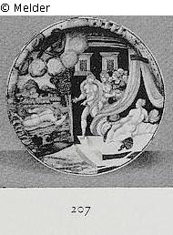 Ceyse und Halcyone (Ovid, Metamorph. XI). Links Ceyse im Meere schwimmend. Rechts Ceyse, der im Sturm untergegangen ist, auf dem Lager der Halcyone, die erschreckt zurückweicht. Oben in den Wolken sitzt Juno mit dem Pfau. Unter dem Boden: de Alcion la vision tremenda e vera. Quelle: Paul Graupe: Gemälde, Kunstgewerbe aus verschiedenem Besitz, Ostasiatisches Porzellan aus dem Besitz der Prinz-Albrecht-Linie des vormals Preußischen Königshauses und aus drei Privatsammlungen. Auktion vom 20. und 21.10.1936. Berlin 1936.