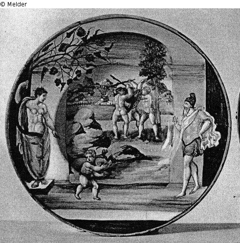 Teller mit flach gemuldeter Mitte und breitem Rand. Dekor in Blau, Gelb, Grün und Mangan auf weißem Grund: Der Traum des Astyages, König der Meder, der aus dem Bauch seiner einzigen Tochter eine Weinrebe wachsen sah, die mit ihren Zweigen ganz Asien überschattete. Gelbe Randlinie. Auf der Unterseite im Fußring blaue Inschrift "Dil ... Astiagie Re lalta visione Nel libro de iustino istori ... 1545". Auf Klebeetikett u.a. bez. ehem. Smlg. Crodel. Best., Sprung, rest.