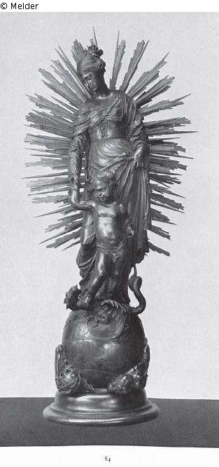 Maria, von einer Strahlenglorie umgeben, mit einer Krone auf dem vorn gescheitelten, nach hinten hochgebundenen Haar, auf der Weltkugel stehend, hält mit der Rechten das segnend erhobene Händchen des vor ihr auf einem Drachen stehenden Knaben. Maria, in einem Kleid mit geschnürtem Mieder und einem um die Schultern gelegten Mantel, blickt nach rechts unten. Die Erdkugel - mit Ländern und Meeren in flachem Relief, dem Äquator, der Sonnenbahn und den Breitengraden in flachen, die Kugel umziehenden Bändern - ist zwischen Tod und Amor, dem die Augen verbunden sind, eingebettet. Statuette hinten ausgehöhlt. Der Arm des Kindes und die rechte Hand der Maria waren abgebrochen. Der Zeigefinger der rechten Hand ist abgebrochen. Der Kopf des Drachens ist ergänzt.