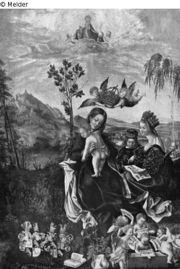 Tafelmalerei: Bild: Madonna mit Heiligen & Katharina von Alexandrien, jungfräuliche Märtyrerin; mögliche Attribute: Buch, Krone, Kaiser Maxentius, Palmwedel, Ring, Schwert, Rad & Barbara, jungfräuliche Märtyrerin; mögliche Attribute: Buch, Kanone(nkugel), Krone, Kreuz, Kelch mit Hostie, Dioscuros (ihr Vater), Pfauenfeder, Schwert, Fackeln, Steinmetzwerkzeuge, Turm & Engel, die jemanden krönen und/oder Palmzweige bringen& Berg, hoher Hügel; Heiliger & Katharina de Alexandria (Heilige); Kaiser; Palmwedel; Ring; Rad; Maxentius (Kaiser); Buch; Krone; Schwert & Barbara (Heilige); Kanone; Kanonenkugel; Kelch; Hostie; Dioscuros; Feder; Pfauenfeder; Fackel; Turm; Steinmetz (Werkzeuge des); Werkzeug; Buch; Kreuz; Krone; Schwert & krönen& Hügel; Signatur: Rechts unten: 1512/Jb (verbunden); Maße: 75 x 52 cm
