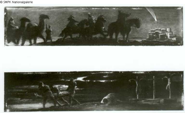 Tafelmalerei: Bild: der tote Christus wird zum Grab getragen & Golgatha: das Kreuz (die Kreuze) im Hintergrund & Landschaften, die die Nacht darstellen oder symbolisieren (manchmal benannt als: Nox)