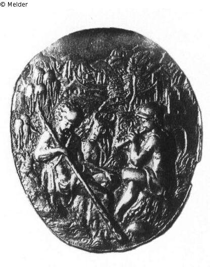 Ovale Plakette, schmale Randleiste, die oben und rechts fehlt. Rechts sitzt Merkur mit Flügelhut und kurzem Gewand auf einem Baumstumpf und spielt die Flöte, um den Argus einzuschläfern, der ihm, gestützt auf seinen langen Hirtenstab, gegenübersitzt. Zwischen ihnen erscheint der Kopf der Io. Im Hintergrund sieht man eine bergige Landschaft mit Bäumen und Gebäuden. In den Musei Civici von Brescia befindet sich außerdem ein Gegenstück mit Jupiter und Io. Nach Rossi stammen die beiden Stücke vielleicht aus der Werkstatt des Paul Hübner. Auf einem Stich von Pier Francesco Mola findet man eine vergleichbare Szene.