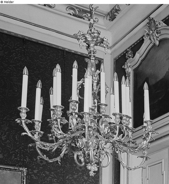 Dresdner Schloss, 2. OG Zwischenflügel Nord, Vorzimmer zum Dantezimmer; Im Inventarverzeichnis Nr. 1 vom 31.01.1920, als Bestandteil des Auseinandersetzungsvertrages des Freistaates Sachsen und dem vormaligen Königshaus von 1924, wird unter „Kammerdiener Zimmer am Dantezimmer“ „1 Bronzekronleuchter“ aufgeführt, welcher als rot angekreuztes Rauminventar dem Staat zufällt. Der Kronleuchter aus dem „Vorzimmer zum Dantezimmer“ wurde entweder bereits am 13.04.1944, spätestens mit dem zweiten Transport am 21.04.1944 nach dem Bergungsort Rittergut Brauna bei Kamenz ausgelagert. Zu den Verlustumständen dieser Objekte ist nichts bekannt. Ein Verlust im Zusammenhang mit den Ereignissen des 2. WK wird vermutet.