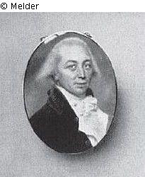 Auf Elfenbein, oval; Brustbild schräg, der Kopf nach vorn gewendet. Bartloses Gesicht mit blauen Augen; das grau gepuderte Haar seitlich breit gelegt. Blauer Rock mit Silberknöpfen und weißes Jabot in aufgeschlagener weißer Weste. Graugewölkter Grund. Links bezeichnet IS. 1792 I. - Der schmale Rahmen und die Rückseite aus Gold; oben zwei Kettchen mit Hängeöse. 1792 in Indien gemalt.