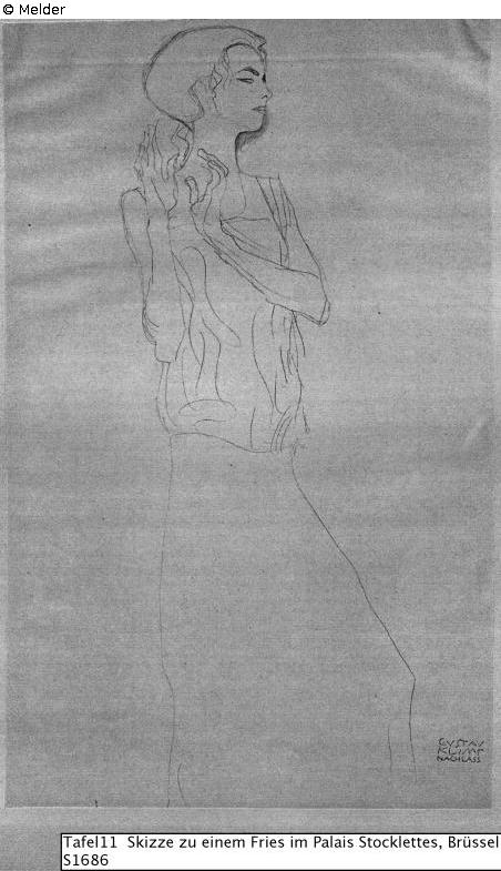 nach Werkverzeichnis Strobl: Stoclet-Fries 1905-11; Studien für die "Tänzerin" ("Die Erwartung"), Kompositionsskizze, 1907/08; Kat. Nr. 1684 -1693; Strobl Werkverzeichnis z. No.: 1686; Titel: Mit erhobenen Unterarmen nach rechts stehend; Bleistift; Maße unbekannt. Nachlaßstempel.