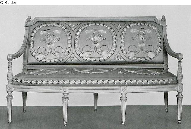Sofa und vier Sessel im Louis XVI.-Stil, weißlackiertes Holz mit gesticktem Seidenbezug, profilierte und geschnitzte Gestelle, kannelierte Säulenbeine, die leicht nach außen, ausladenden Armstützen ruhen auf geschnitzten Säulchen, auf den Lehnen geschnitzte Pinienzapfen als Zierate