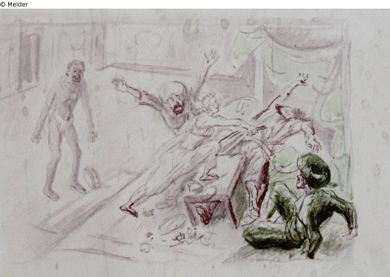 Sammlung Eduard Fuchs bis 1933; 26.10.1933 Beschlagnahmung durch das Finanzamt Berlin-Zehlendorf; 15.12.1933 Übergabe an die Gestapo laut Überlassungsprotokoll: Paket 5: „1 Skizze, darstellend eine Mordscene (gez. Slevogt)"; 19.09.1935 kurzfristige Freigabe der Sammlung Fuchs durch den Reichsminister für Wissenschaft, Erziehung und Volksbildung; Verbleib unbekannt