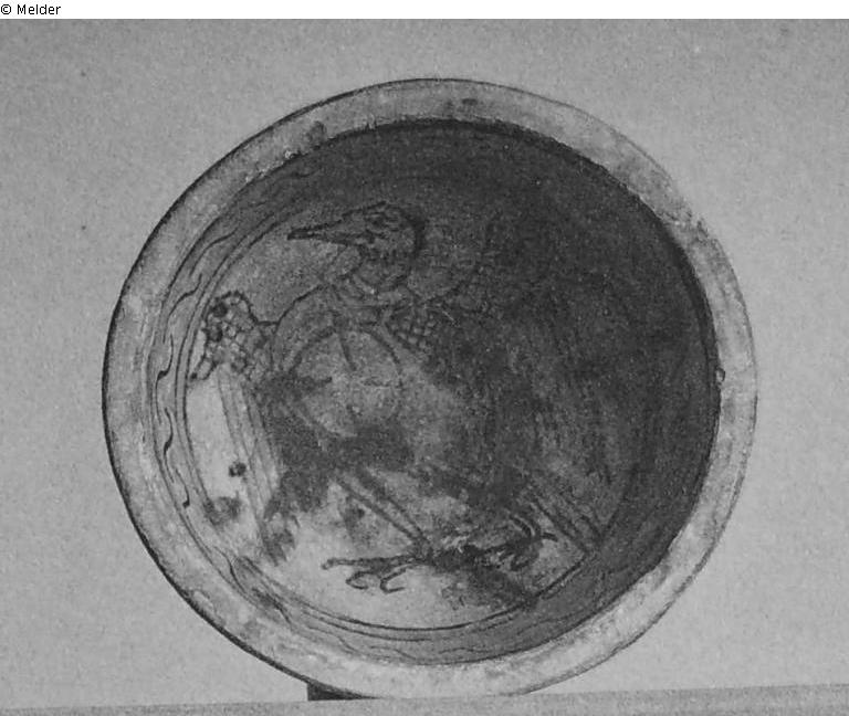 Mit steilem, außen scharf abgesetztem Rand und Ringfuß. Schmutzigweiß glasiert; bemalt in blaßem Grün und Mangan. Im Spiegel ein zum Flug ansetzender Vogel, auf der Brust ein Kreis, ringsum grünes, Mangan konturiertes Band, darüber auf der Wandung ein Fries von S-förmigen Manganstrichen. Auf dem oberen Rand und auf der Außenwandung ein grüner Streifen. Repariert.