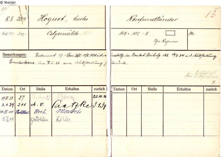 Historische Karteikarte mit dem Inventarverzeichnis der Kunstsammlung aus dem Zeitraum 1933-1945)