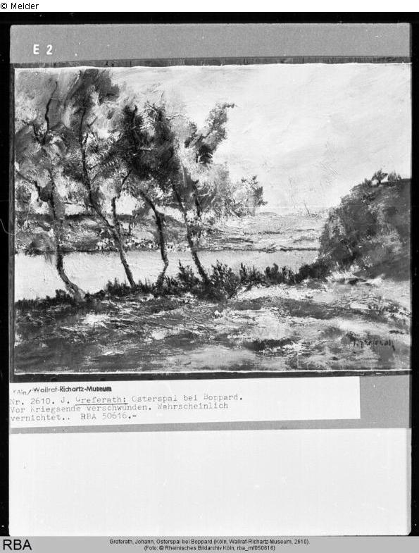 Suchmeldung | Einzelobjekt Osterspai bei Boppard Rheinlandschaft Lost Art-ID585381 Vorherige Weiter Hersteller/Künstler:in Greferath, Johannes Geburt 1872.08.18, Schelsen (Nieder-Rhein) Tod 1946, Köln TitelOsterspai bei BoppardZusatztitelRheinlandschaft Datierung1801/2000ObjektartMalereiObjektgruppeMalereiMaterial / TechnikLeinwand / gemaltAbmessungen80 x 60 cm InventarnummerWRM 2610Provenienz 05.1938 Wallraf-Richartz-Museum, Köln. Seit 1945 Verbleib unbekannt. Weiterlesen Weniger anzeigen Veröffentlicht seit30.01.2020 Kontakt Wallraf-Richartz-Museum & Fondation Corboud Obermarspforten 50667 Köln Deutschland Tel+49(0)221/221-22372Fax+49(0)221/221-22629Homepagehttp://www.wallraf.museum Ansprechpartner:in Dezernat für Kunst und Kultur der Stadt KölnPositionMuseumsreferat, ProvenienzforschungTel+49(0)221/221-22520E-Mailprovenienzforschung@stadt-koeln.de
