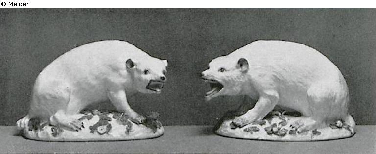 Ein Paar Vielfraße, sitzend und fauchend. Die offenen Mäuler, Augen, Ohren und Tatzen eisenrot, hellbraun und hellgrau staffiert. Bunte Blüten und Blätter auf den Sockeln. Ohne Marken.