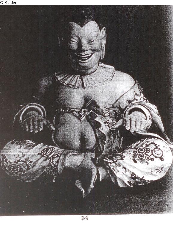 Schnorr von Carolsfeld: groß, sitzend, mit angezogenen, breit zur Seite gelegten Beinen und überkreuzten Füßen. Die Arme gebeugt, die beweglichen Hände flach nach vorn gestreckt. Der bewegliche Kopf mit Schlitzaugen, offenem Mund, großen Ohren, spitzem Haaransatz und kleinem Zopf am Scheitel. Das weitärmelige Gewand bogenförmig ausgeschnitten. Unter der Brust ein gelber, mit Edelsteinen besetzter Gürtel. Schultern, Brust und der vortretende Leib entblößt. Doppelter plissierter weißer Kragen mit Goldsäumen. Das Gewand weiß mit großen indianischen Blumensträußen in Eisenrot, Purpur, Blau, Gelb und zweierlei Grün, dazwischen goldene Zweige. Die Innenseite lichtpurpurn mit goldenem Saum. Die Strümpfe weiß, die Schuhe gelb, die Sohlen rötlichbraun. Mitte 18. Jahrhundert. Modell von Kändler. Schwertermarke.